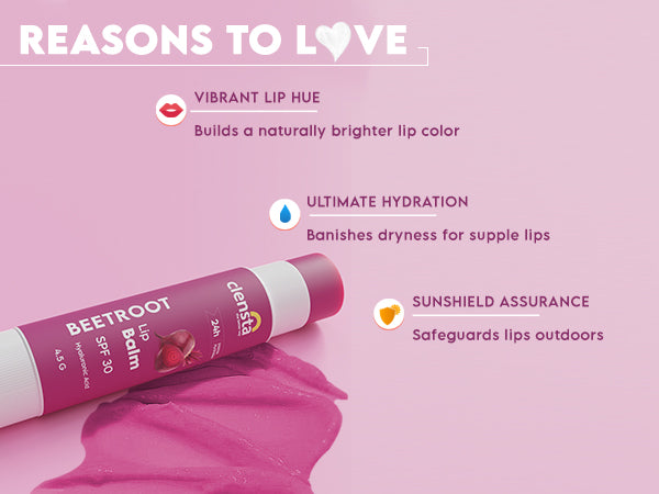 Our Beetroot Lip Balm is a fusion of beauty and wellness as it offers a natural tint to give you an extra oomph while also providing essential hydration to make your lips soft and plumpy. This lip balm also contains SPF 30 to defend against sunburns, ensuring comprehensive lip care.What It Does-