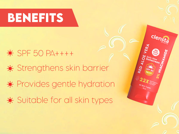 Introducing Clensta's Red Aloe Vera Daily Glow Sunscreen, your ultimate companion for radiant and protected skin all day long. Formulated with the goodness of red aloe vera, renowned for its soothing and rejuvenating properties, this sunscreen not only shields your skin from harmful UV rays but also enhances its natural glow.What It Does-
