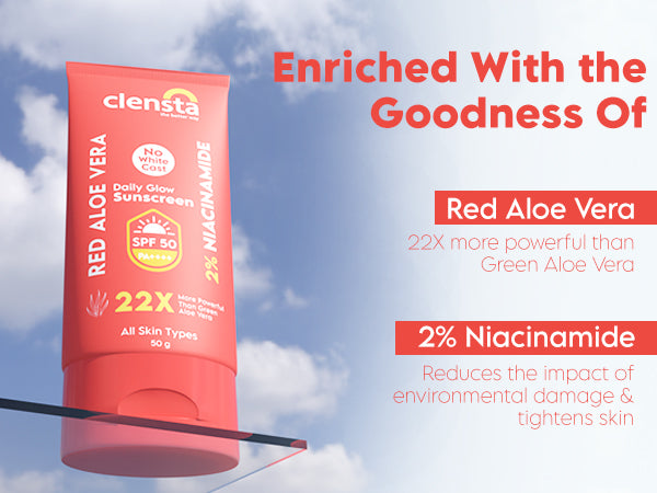 Enriched with antioxidants and moisturizing agents, including red aloe vera extract, this sunscreen nourishes and hydrates your skin, keeping it soft, supple, and luminous throughout the day. Say goodbye to dull, dry skin and hello to a radiant, sun-kissed glow with Clensta's Red Aloe Vera Daily Glow Sunscreen.How It Does-