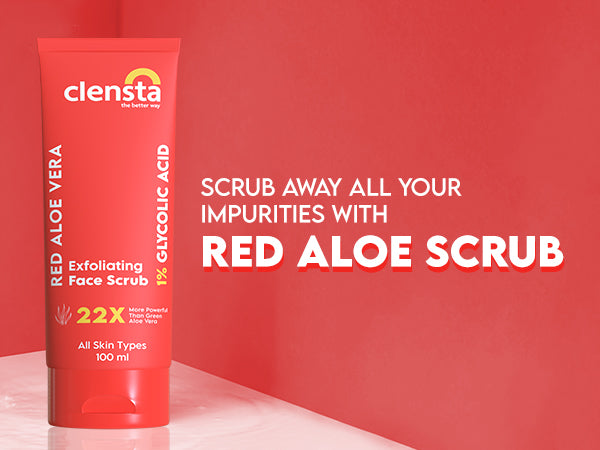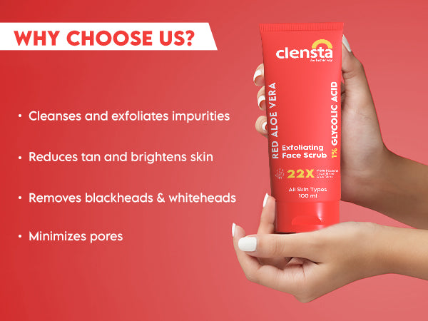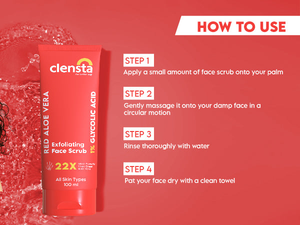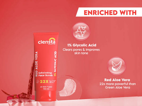 Clensta Red Aloe Vera Exfoliating Face Scrub, a dynamic skincare solution merging the rejuvenating powers of glycolic acid with the soothing benefits of red aloe vera. Perfect for all skin types, this face scrub provides a refreshing and rejuvenating experience, unveiling your skin's natural glow and vitality. Experience the transformative effects of Clensta Red Aloe Vera Exfoliating Face Scrub today for a revitalized and radiant complexion.What It Does-
