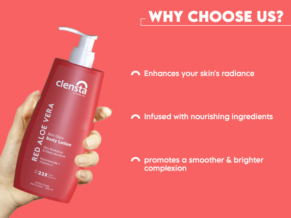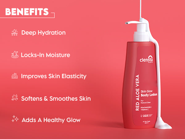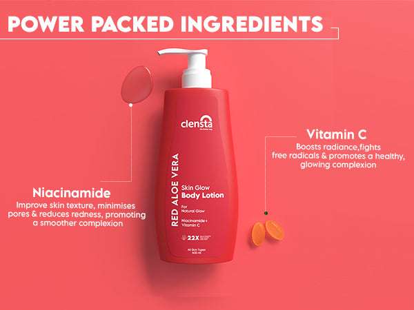 The Skin Glow Body Lotion is essential for comprehensive skincare and is formulated with Vitamin C, Niacinamide, and Red Aloe Vera for an overall improvement in skin texture and appearance.What It Does-