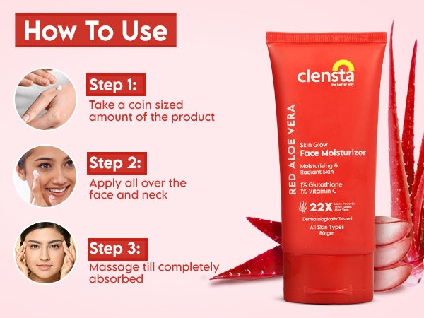 Harnessing the power of Red Aloe Vera's regenerative properties, Glutathione's melanin-reducing effects, and Vitamin C's anti-ageing benefits, the moisturizer works on improving the skin texture and visibly reducing dryness, leaving behind a smoother, more supple skin.- Clean your face and pat it dry.
