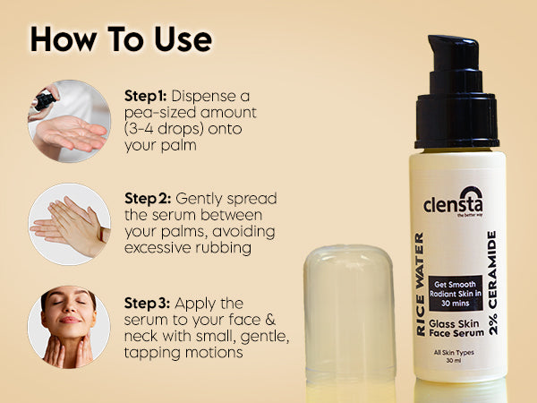 Our Rice Water Face Serum with 2% Ceramide works by delivering a potent blend of nourishing ingredients to your skin. The rice water deeply hydrates and brightens, while also improving texture and soothing irritation. Meanwhile, the ceramides reinforce your skin's natural barrier, locking in moisture, enhancing smoothness, and reducing the appearance of fine lines and wrinkles.- Dispense a pea-sized amount (3-4 drops) onto your palm