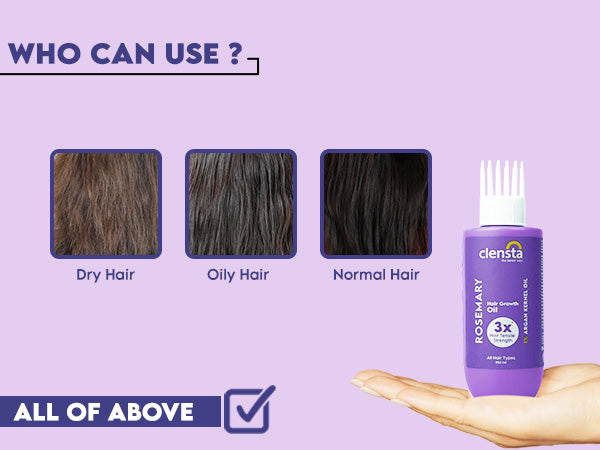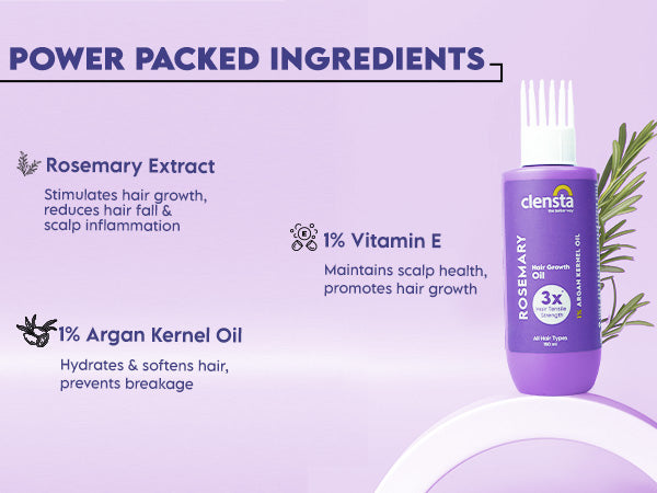 Infused with 1% Argan Kernel Oil rich in vitamins, minerals & antioxidants, Clensta Rosemary Hair Growth Oil provides hydration, infuses nourishment & prevents breakage.
