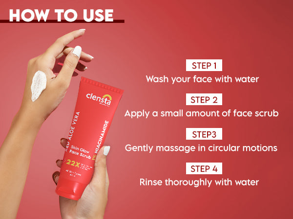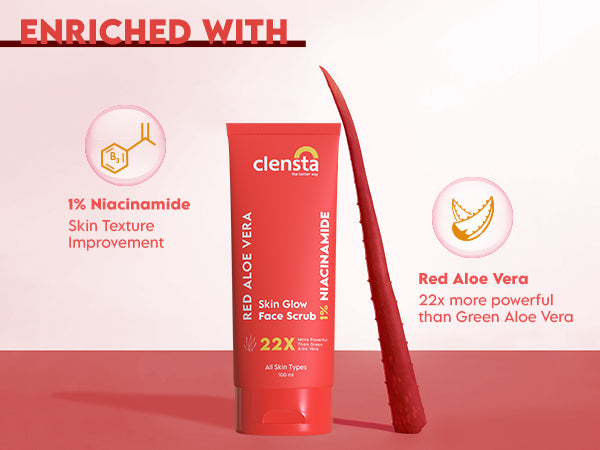 Clensta Red Aloe Vera Skin Glow Face Scrub combines the nourishing properties of red aloe vera and the brightening benefits of niacinamide. This exfoliating scrub gently removes dead skin cells and impurities, revealing a smoother, more radiant complexion. Red aloe vera hydrates and soothes, while niacinamide reduces hyperpigmentation and minimizes pores, promoting an even skin tone.What It Does-
