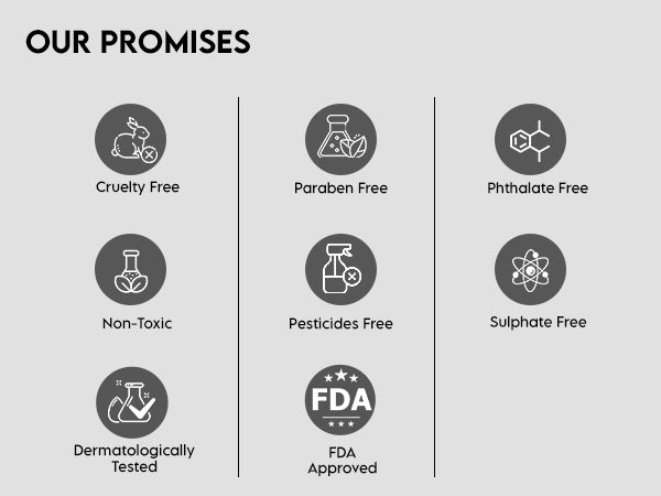 Dermatologically Tested | Approved by FDA | Cruelty Free | Paraben Free | Phthalate Free | Non Toxic | Pesticides Free | Sulphate Free
